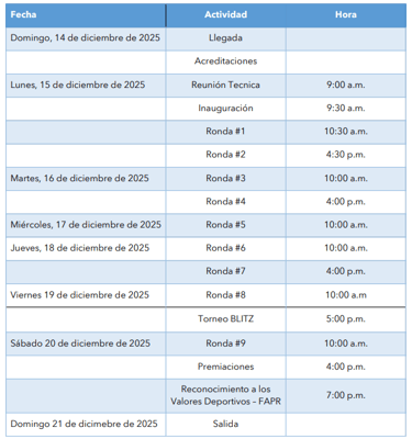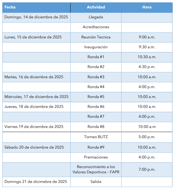 La Federación de Ajedrez de Puerto Rico se reserva el derecho de admisión en el XX Festival de Ajedrez Centroamericano y del Caribe de la Juventud 2025, con el objetivo de asegurar el cumplimiento de las normativas establecidas y mantener la integridad del torneo. Esta medida se toma para garantizar un ambiente competitivo justo y seguro para todos los participantes.