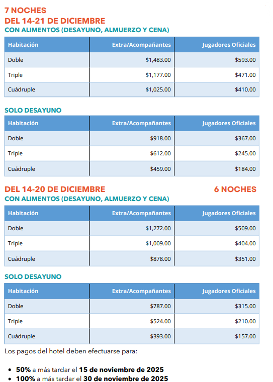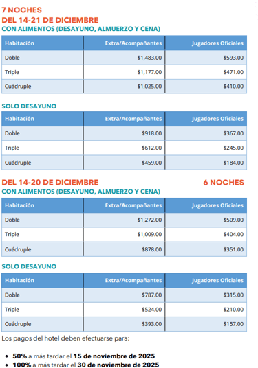 -La fecha límite para la inscripción de jugadores “Extras” y acompañantes será el 30 de noviembre de 2025, sujeto a disponibilidad de habitaciones.